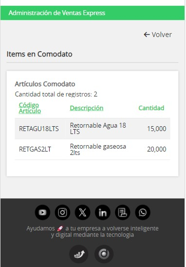 En la próxima entrega, al hacer click en el botón "Artículos Comodato" el Vendedor verá lo siguiente: