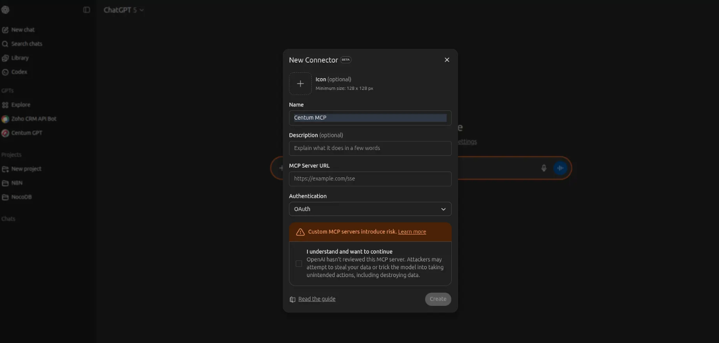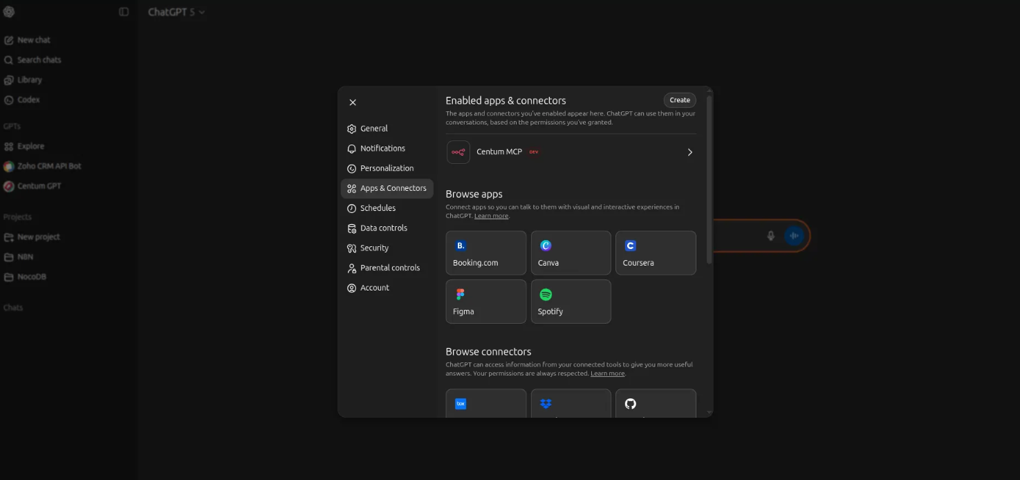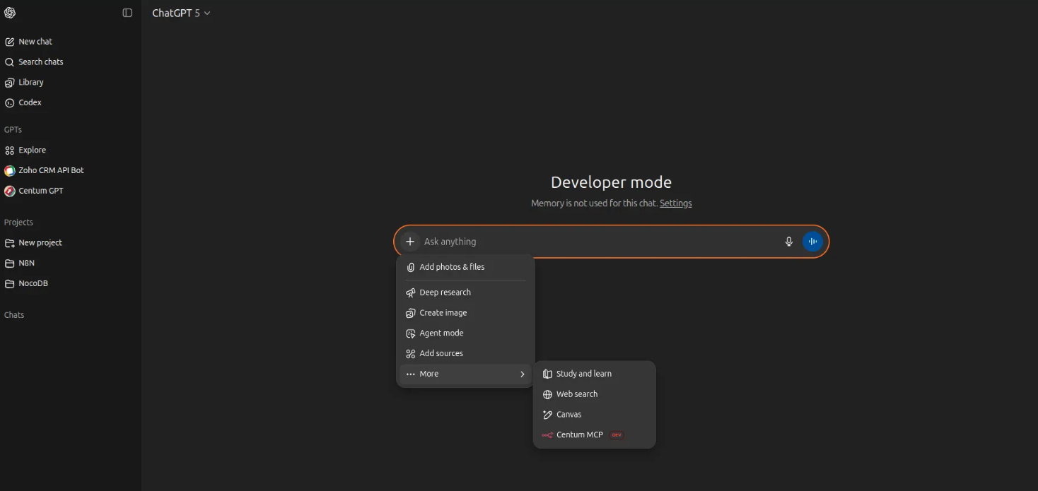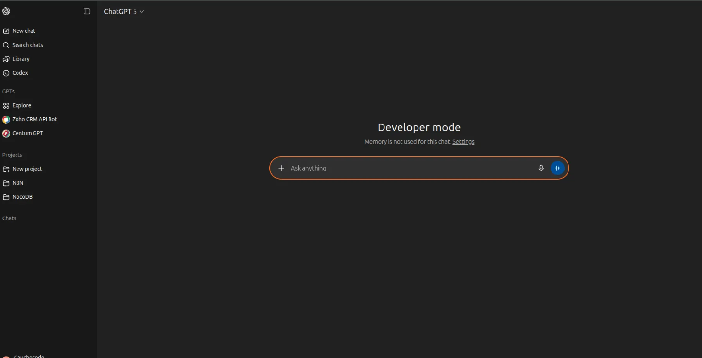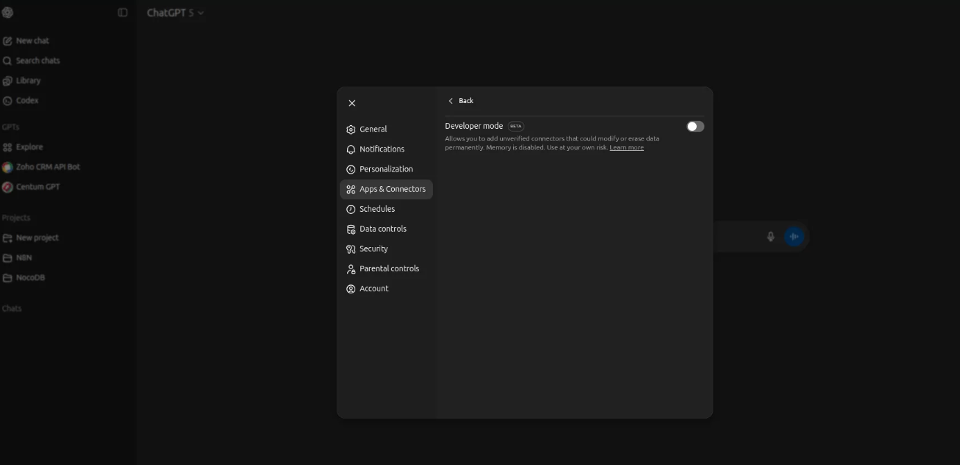Activar el modo desarrolladorDesliza hacia el final de los conectores hasta que encuentres la opción “Configuración Avanzada” y activa la opción “Modo Desarrollador / Developer Mode”. (Es importante aclarar que para poder acceder a esta configuración, es obligatorio tener una cuenta Pro, Plus, Business, Enterprise o Education. De lo contrario esta opción no estará disponible.)