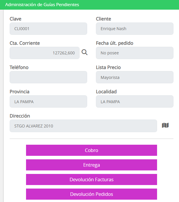 Una vez que el chofer seleccione la guía, se visualizarán todos los pedidos que contiene la guía junto con los datos de cada cliente. El chofer deberá ir seleccionando cada pedido una vez que haya llegado al destino de entrega, en donde se visualizará lo siguiente:
