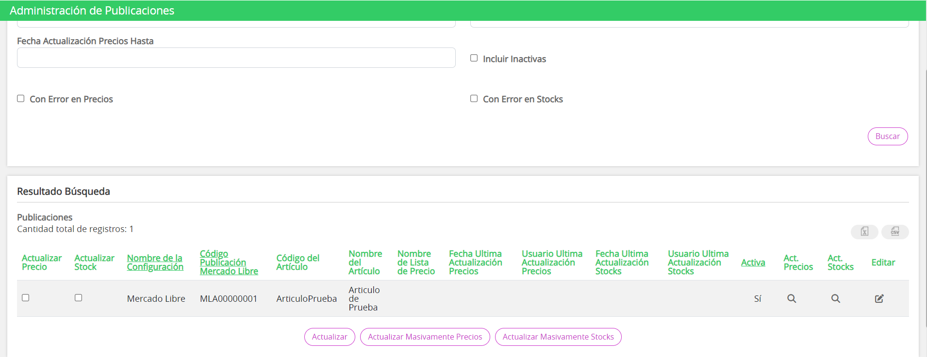 3. Una vez creada la publicación, desde el botón de acción "Act Precios" y "Act Stocks" se podrá llevar un control de las actualizaciones que van impactando en la publicación. Es decir, por cada actualización de precios y/o de stock que se realice en la sucursal y/o lista de precios que pertenezca a dicha publicación se visualizará un nuevo registro por cada línea.