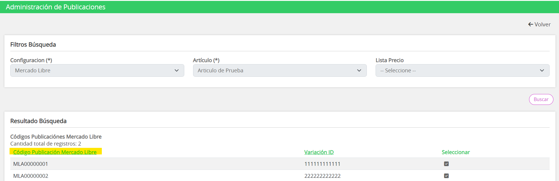 Mercado Libre le indica a cada publicación un código de identificación. Por lo tanto, al realizar la búsqueda de la publicación desde CENTUM, se debe verificar que el "Código Publicación Mercado Libre" coincida con el código propio de la publicación de ML.