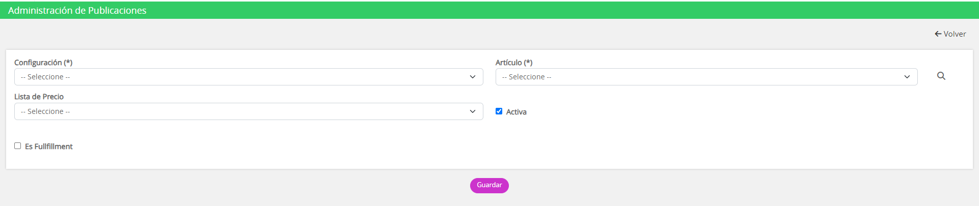 1. Una vez dada de alta la configuración con la cuál se va a operar con la interfaz de Mercado Libre, desde el módulo Mercado Libre --> Publicaciones, se deberá comenzar con el alta de cada una de las publicaciones.